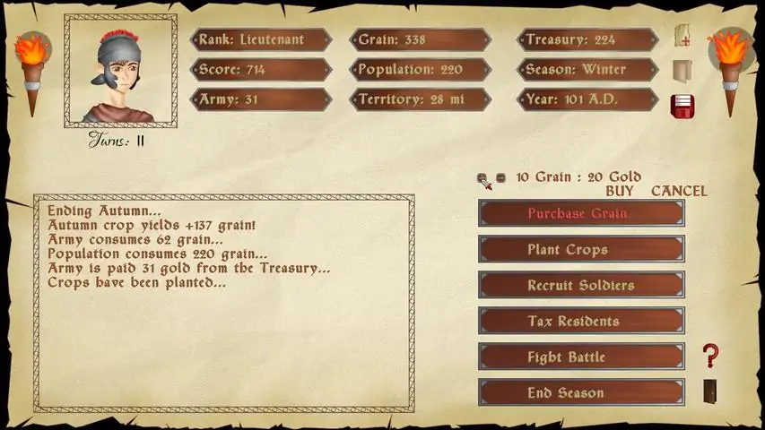 You are a soldier of the Imperi...a Sergeant and you have been ordered to start a settlement in uncharted territory. You are given 10 troops in your army, 25 civilians, 100 gold for the treasury, 100 grain for food, and 5 square miles of terrain. Your goal is to grow this into a province. Each step along the way, you gain rank from the Imperi. If you grow this into a Province, the Imperi will make you King of the Province. F E A T U R E S : - Simple to use and intuitive point-and-click interface - Challenging, but balanced, management simulation experience - Smart AI helps balance grain shortages to minimize calamity during famine - Adjusts outcomes realistically based off of both probability and yearly season - 20 Achievements - Extremely Affordable Price - Text-based Strategy Simulation - Turn-based rounds (3 turns per season)