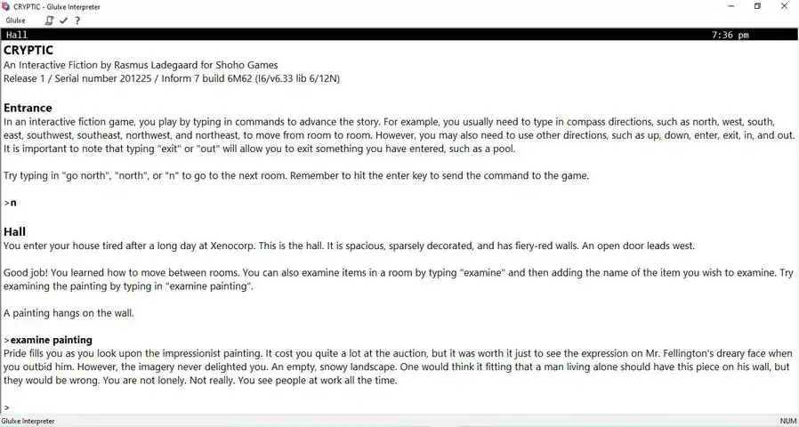 CRYPTIC is a classic text adventure, akin to Zork, wherein you type commands to advance the story and to solve various puzzles in the game. This means that the game is entirely text-based - you will find absolutely no
