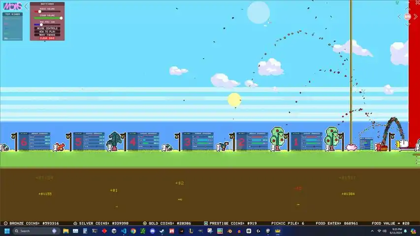 FEED DA KING!Workers throw crops into your picnic basket. You can click or automate to throw the food from the basket into Da King's mouth. When Da King eats, he will throw a coin into your piggy bank, and his belly will increase, granting you rewards along the way. Use different coins for various upgrades and to add more workers. The only limitations are either your time or your rig. How big can you grow Da Kings belly?