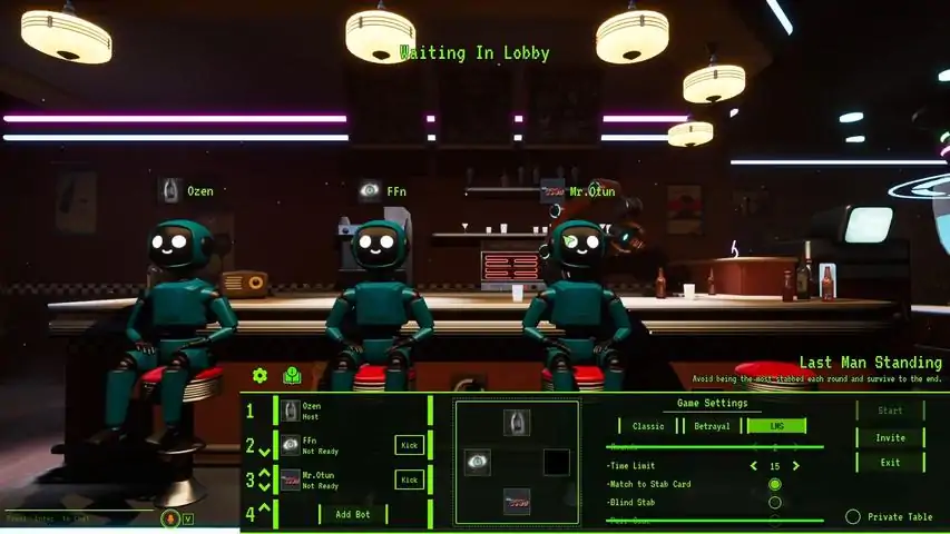 "一张桌子。几张牌。一个目标:不要被刺伤。 欢迎来到 Stab Club坐在 Stab Bots 桌旁,这些古怪的机器人玩家专为竞争而生。大家都在微笑…直到有人被刺伤!在这款回合制桌面卡牌游戏中,匹配能增加彼此刺伤点数的卡牌来交换攻击。最后刺伤点数最多的人?出局!简单规则,残酷结果每轮,你将抽牌、计划并出牌以改变局势。在攻击、防御或重新引导刺伤时,时机和桌面意识至关重要。 桌面讲述故事游戏节奏快,但恩怨持久。一次错误决定可能让局势逆转,而一次幸运抽牌可能改变结果。没有两场比赛是相同的。每一次刺伤都会留下痕迹。这张桌上没有朋友信任是一种奢侈。每张打出的牌都可能背叛你,即使是来自 Stab Bots! 按你的方式游戏挑战 AI Stab Bots,或在本地或在线比赛中与朋友对战。