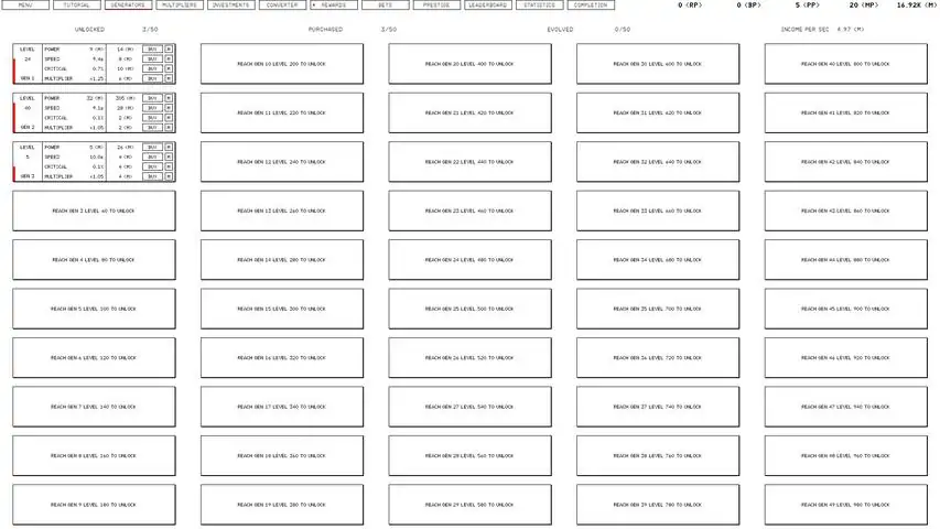 Idle Ultimate is the most complex, varied and interesting idle game. Your possibilities are endless. Passive income, active income, prestige system, multipliers, bets, investments, converters, rewards, ranking system - choose your own activity and use it to maximize your profit!Gameplay features:GOALS AND MEANSUse 5 different currencies and various income systems to complete all goalsGENERATORSUnlock 50 generators with various upgrades and powerful evolution systemMULTIPLIERS400 different multipliers to unlock. Each one matters and boosts your profitPRESTIGEComplex prestige system with dozens upgrades which affect everything in the gameINVESTMENTSDeposit your funds to get stable passive incomeBETSAre you willing to risk your funds to hit the jackpot?CONVERTERSDo not want to farm the required currency? Welcome to the exchange page!ACHIEVEMENTS100 various Steam achievements are waiting for you to be collectedSTATISTICS70 various stats are tracked for your convenience and benefitREWARDSGet various and useful bonuses even if you are awayRANKINGIt's not just an idle game. This is a global competition for those who want to take part in itCOMPLETIONUnlike many other idle games, this one can be finished. But don't think it will be easy!SETUP EVERYTHINGLight and dark theme, various currencies and numbers display, switchable music with 20 tracks and many more options Idle Ultimate is an idle game you have never played before. Endless features and possibilities. Try it now and have the fun you deserve!