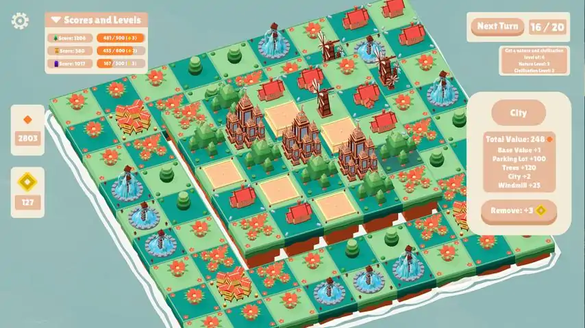 Select from a wide variety of building types to develop your island. Each building has its own area of effect and can either boost or negatively affect the scores of other buildings in that area. Strategically place buildings next to each for a bigger score boost. A bigger score means more currency. More currency means you can buy more buildings. Strategize -> Place Buildings -> Boost Score -> Collect Currency -> Repeat