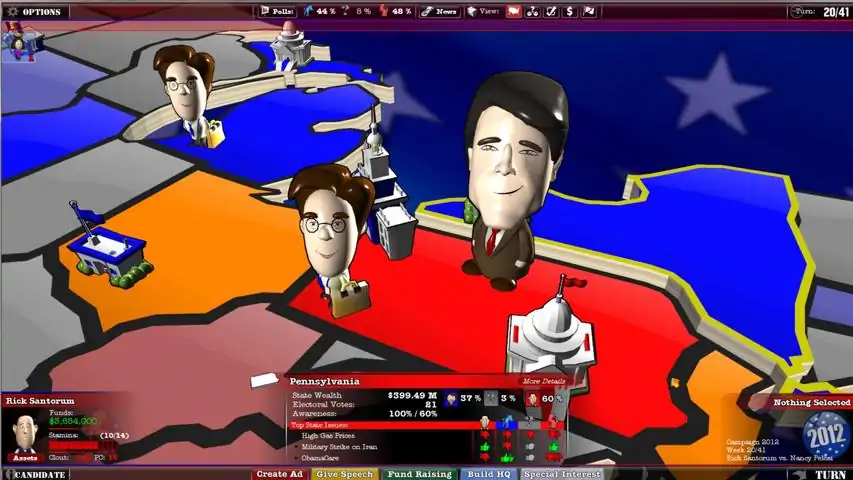 Do you have what it takes to be president?Play as more than 20 candidates including Barack Obama, Mitt Romney, Rick Santorum, Ron Paul, Newt Gingrich or create your own candidate from