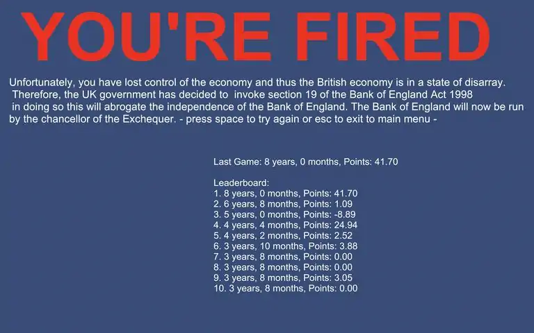 This is a monetary policy sim that allows the player to control the interest rate and level of quantitative easing/tightening set by the Bank of England and see the effect this has on the British economy. GAME MODESPlayers can pick between the main game mode in which players must keep the British Economy from collapsing whilst making sure inflation remains within the Bank of England targets of 2% +/- 1% otherwise the player will be fired this allows players to try and beat their high scores and try to remain in power for as long as possible. Or the other game mode is Endless mode where it is impossible for the player to be fired and is thus able to experiment and tamper with interest rates and QE/QT as much as they want and see the effects of their measures on the British economy. Key Features:Realistic Economic Model: Experience the real-world challenges of balancing economic growth with