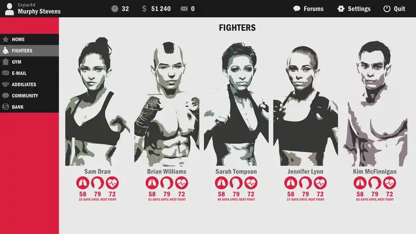 Welcome to the Ultimate Fight Manager 2016 Early Access We decided to enter Early Access with a fairly incomplete game. The reason for this is that we want to get feedback early in the process to be able to implement requests and ideas from the community. With that said, please keep in mind that the game is fairly incomplete at the time of the Early Access launch. We will provide weekly updates, so you'll know exactly what we are working on and how far we have come in the process of completing our tasks.