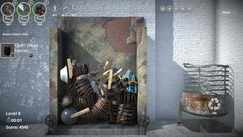 An exciting and engrossing arcade, in which your goal is to destroy everything you see and not be overwhelmed. Crush! Saw! Throw! Do everything you can to achieve goals! There are several basic mechanics available to you: break all that is breakable, saw the wood, throw metal objects into the trash can and recycle them. Also there are several abilities that will aid you in your quest of destruction. The game contains plethora of levels, each with its own unique goals, interesting situations and challenges of your reaction and decision making skills.