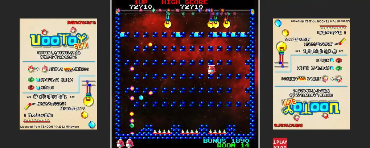 The legendary comical action puzzle game 'Uootoy' -- which was first published in the August 1984 issue of I/O Magazine (published by Kougaku-sha), gained popularity on the FM-7, PC-88, and Sharp X1. Now the ultimate evolution has arrived in the form of 'Uootoy 3671'. The objective of the game is simply to arrive at the goal. However, a plethora of obstacles stand in your way. Simplistic yet amazingly varied, every stage is bound to keep you entertained. TENTEN-kun, the star of the original 'Uootoy', will be joined by TELTEL-chan. As either the hero or heroine, players can take on all 100 of the original Uootoy's stages. An even greater challenge awaits in the story mode, which contains 100 new stages. A map editor is also included, ensuring many sleepless nights for dedicated players. Uootoy 3671 features a team of massively talented musicians. WING, whose credits include the 'Mega Drive Mini 2' and previous Mindware titles, has produced the sound system. Junko Ozawa, the legendary Namco composer. * WING, whose credits include the 'Mega Drive Mini 2' and previous Mindware titles, is the producer of the game's sound system." * Junko Ozawa, the legendary NAMCO composer who has worked on Nintendo classics such as 'Rhythm Heaven' & 'Tomodachi Collection'." * Daisuke Shiiba, another fantastic artist responsible for works on 'Rhythm Heaven', 'Tomodachi Collection', and the 'Final Fantasy Pixel Remastered' series."