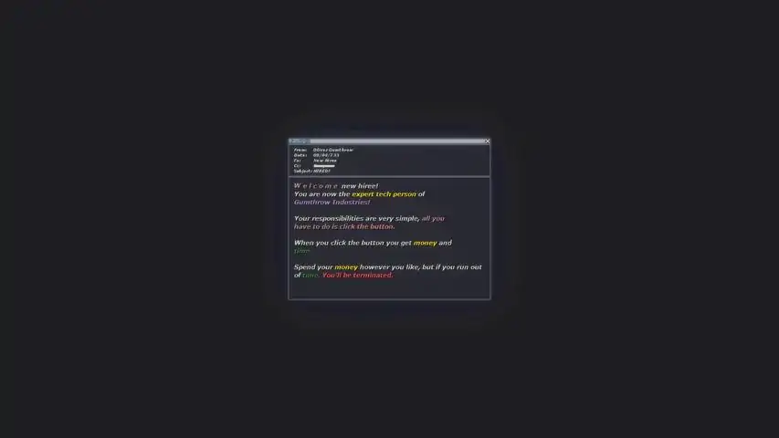 Hi there! Oliver Gumthrow here!I'm looking for anyone and everyone capable enough to use a monitor and a mouse! If this sounds like you then you are 100% qualified to be our new expert tech person at Gumthrow Industries!This very important button needs to be clicked, and you'll be paid for it! That's right money in your pocket, and a secure and stable job! Earn pay raises, customize your workspace, and upgrade your work experience. While clicking the button do not get distracted, if you take too long to click the button you'll be terminated and replaced