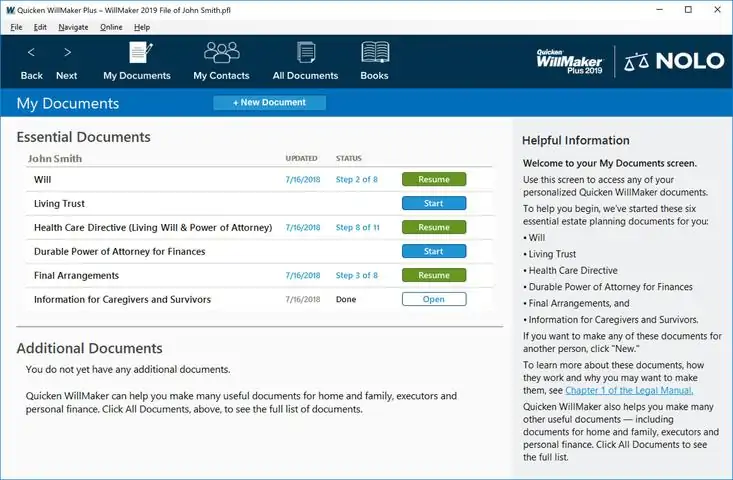 Quicken® WillMaker® Plus 2019 and Living Trust is the easiest way to create your estate plan, whether you're just getting started or you want to update your previous arrangements. This powerful software guides you through the process from beginning to end, giving you the practical and legal information you need to make the best decisions for you and your family. Quicken WillMaker Plus is the original will-writing software, created and updated regularly by Nolo’s experts. Free legal updates will keep your program current through 2019. Technical support is also available. The benefits of using Quicken WillMaker Plus include: • A customized estate plan for you and each member of your family, including a will, health care directive and other essential documents * • An easy-to-use interview format that lets you complete documents at your own pace • A user-friendly legal manual answers common questions • A team of lawyer-editors working to ensure each document reflects the laws of your state* • Get free living trust software! (Requires registration.) * Estate planning documents are not valid in Canada, Louisiana or U.S.Territories. Get Nolo’s Living Trust Software! Register your copy of Quicken WillMaker Plus 2019 to access Nolo’s Living Trust software. Make a legally valid living trust document to ensure that your property bypasses lengthy and expensive probate proceedings and goes directly to the people you've designated. Online Promissory Note Use this online promissory note (like an IOU) to lend or borrow money. With this form, you can choose from the following types of loans: • installment payments without interest • installment payments with interest • lump-sum payment • interest-only payments (balloon payment) You’ll be able to revise, print, send or download your promissory notes at any time during your one-year subscription. Secure access, anytime, anywhere. Free NoloCloud Form When you register your Quicken WillMaker Plus you will also get a free one-year subscription to any online form of your choice. With NoloCloud you can access your form anywhere at any time. We have forms for real estate, estate planning, business, finance and much more. Restrictions apply. Want to know more? Here’s a closer look at what you can do with Quicken WillMaker Plus: Your Will The heart of every estate plan is a will, also known as a last will and testament. This legal document puts you in control of who inherits your property and who would take care of your children if it were ever necessary. Without a will, state law determines these issues. Your will also allows you to name an executor (sometimes called a “personal representative”) to carry out our wishes. And you can appoint a trusted person to manage property left to young people. With Quicken WillMaker Plus, you can revise and update your will whenever you like. Living Trust Ensure that your property bypasses lengthy and expensive probate proceedings. Your Health Care Directive Spare your loved ones difficult decisions by laying out your wishes for medical care and naming someone to carry out your instructions. Health Care Power of Attorney Name a trusted person (your “health care agent”) to make important medical decisions for you if necessary. Living Will State what types of medical treatment you do or do not want if you are too ill or injured to direct your own care. Your health care providers must do all they can to follow your wishes. Your Durable Power of Attorney for Finances A durable power of attorney ensures that someone you trust (called your “agent” or “attorney-in-fact”) will be on hand to manage the many practical, financial tasks that will arise if you become incapacitated. For example, bills must be paid, bank deposits must be made and someone must handle insurance and benefits paperwork. In most cases, a durable power of attorney for finances is the best way to take care of tasks like these. Your Final Arrangements Plan a funeral or other ceremony and ease the burden on your loved ones. Describe your preferences for burial, cremation, memorials, obituaries and more. Documents for Your Executor Make sure your executor has needed forms and instructions to do the job: checklists, letters, notices and claim forms. Information for Caregivers and Survivors Organize your information so that your survivors don't have to. Use this document to give them details about everything from bank accounts, to passwords, to the names of people you’d like contacted in the event of an emergency. Create the following forms with Quicken WillMaker Plus 2019: Estate Planning • Will • Living Trust (requires registration) • Durable Power of Attorney for Finances • Final Arrangements • Health Care Directive (Living Will & Health Care Power of Attorney) • Information for Caregivers and Survivors • Letter to Survivors • Property Worksheet • Revocation of Health Care Directive • Revocation of Power of Attorney Executors • Affidavit of Domicile • Employee Death Benefits Letter • Executor’s Checklist • Executor’s Letter to Financial Institution • General Notice of Death • Notice to Creditor of Death • Request for Death Certificate Home and Family • Authorization for International Travel With Minor • Authorization for Minor’s Medical Treatment • Authorization to Drive a Motor Vehicle • Child Care Agreement • Child Care Instructions • Elder Care Agreement • Housekeeping Services Agreement • House sitting Instructions • Notice to Put Name on Do Not Call List • Pet Care Agreement • Request for Birth Certificate • Subscription or Membership Cancellation form • Temporary Guardianship Authorization for Care of Minor Personal finance • General Bill of Sale • Limited Power of Attorney for Finances • Notice to Terminate Joint Credit Card Account • Online Promissory Note • Revocation of Power of Attorney • Security Agreement for Borrowing Money