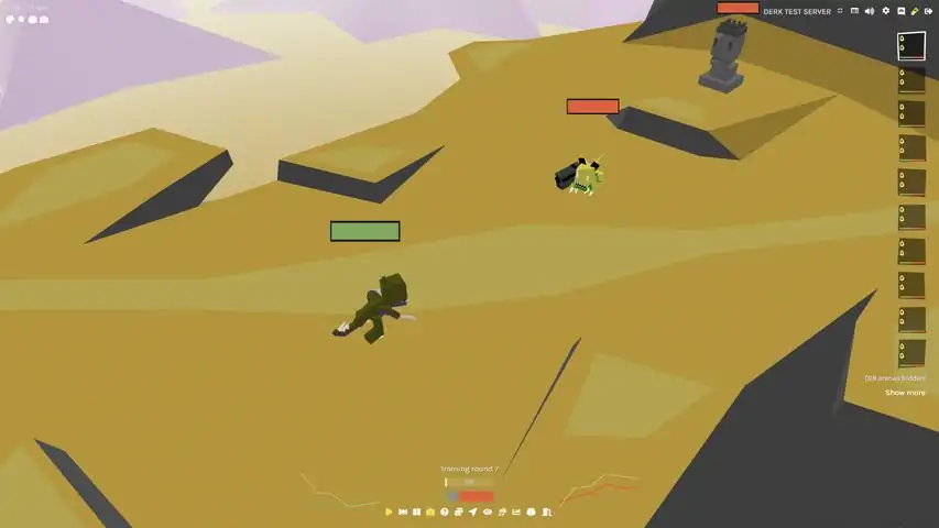 Welcome to Dr. Derk's Mutant Battlegrounds!This is a game where you train Derklings, a creature with a neural network brain, to fight for you! The game takes place in a wonky western-themed MOBA setting, and as you battle other players you earn upgrades and items for your Derklings. The challenge is to figure out the best loadout and training strategy for your Derklings!There are tons of strategies to explore, as the Derklings can be taught to do an endless number of things (thanks to the neural networks). How about teaching one of them to heal a tanky Derkling? Or make one of them dash through the opponents and go straight for the opponents statue? Or an all-out DPS team? Or try to make them trick the opponents? There's a lot to