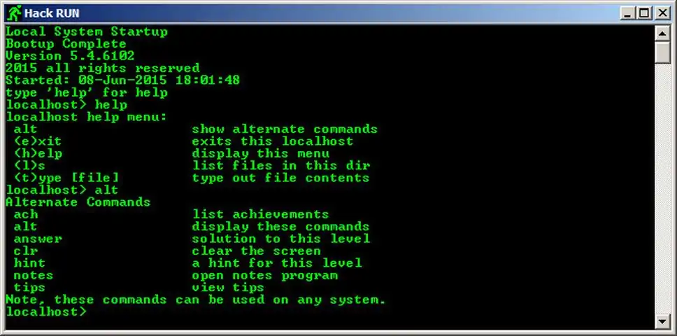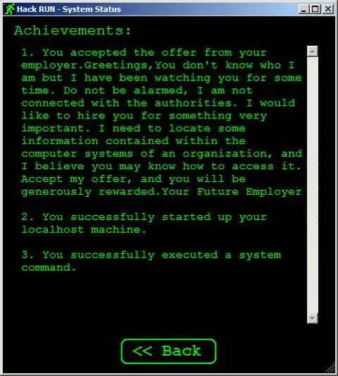 Ever wanted to be a hacker? Hack your way into the heart of a mysterious organization to uncover their secrets. Hack RUN® is a game which uses 'old school' command prompts (like DOS or UNIX) that simulate a real operating system. Learn the commands of each system to help you navigate through your adventure. As you hack into their systems, you will learn about the organization and the people who work there. Read files and emails to find clues and riddles which will give you access to more accounts. Data found on their systems will help you learn about the motives of the organization, and how dark their plans can get. You may also discover dirty little secrets about the employees as well. Hacking into new accounts or discovering key information will increase your skill level. As you achieve your goals, you will move closer and closer to the final achievement; over 50 levels deep! It's time for a Hack RUN!