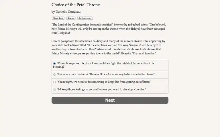 In the Empire of the Petal Throne™, will you find glory, or a knife in your back? "Choice of the Petal Throne" is a 124,000-word interactive fantasy novel by Danielle Goudeau, where your choices control the story. It's entirely text-based--without graphics or sound effects--and fueled by the vast, unstoppable power of your imagination. M.A.R. Barker's world of Tékumel™ is a fantasy universe like no other, where South American, Middle Eastern, and Indian cultures collide. The princes and princesses of the Tsolyáni empire vie for their father's mystical Petal Throne, tearing the nation apart with civil war and political intrigues. As a captain in one of their armies, will you play as male or female, gay straight or bi? A brave and forthright soldier, a hedonistic intriguer with a heart of gold, or scheming double agent?
