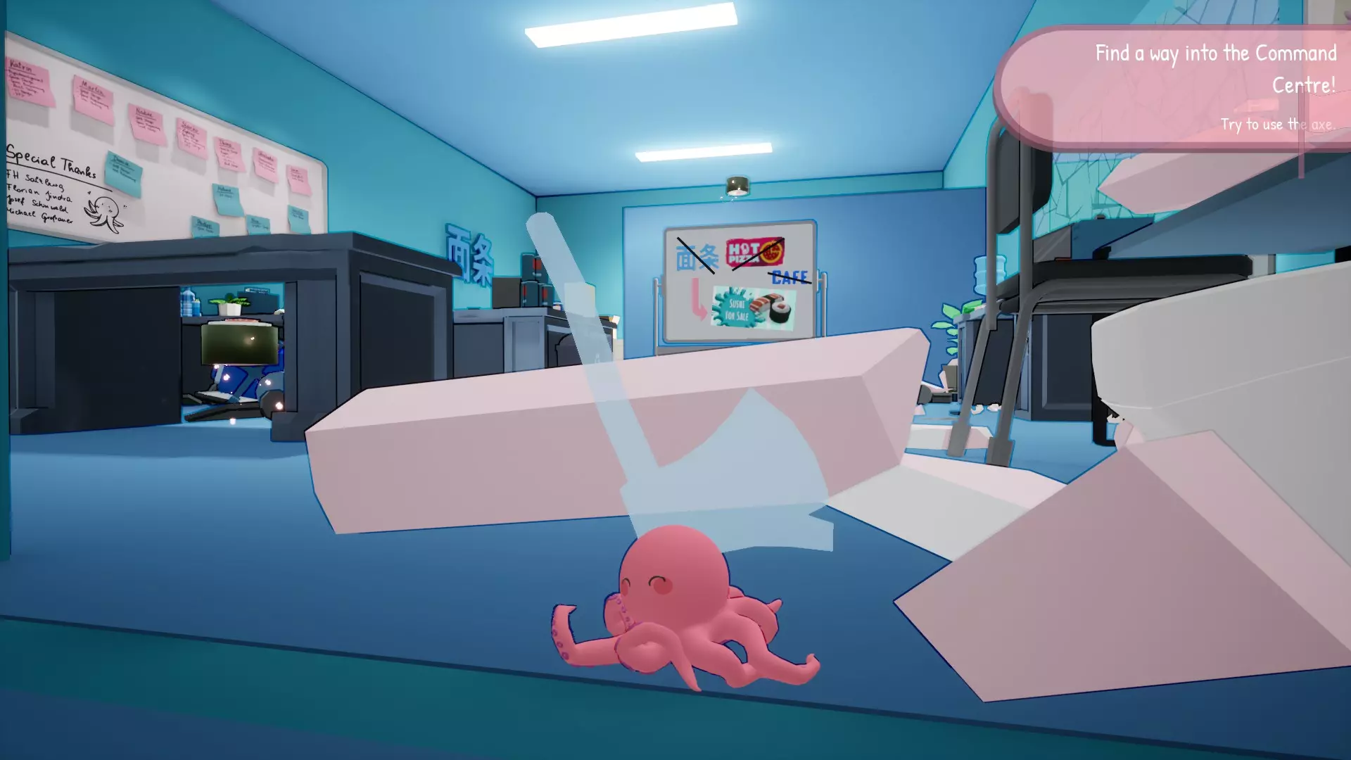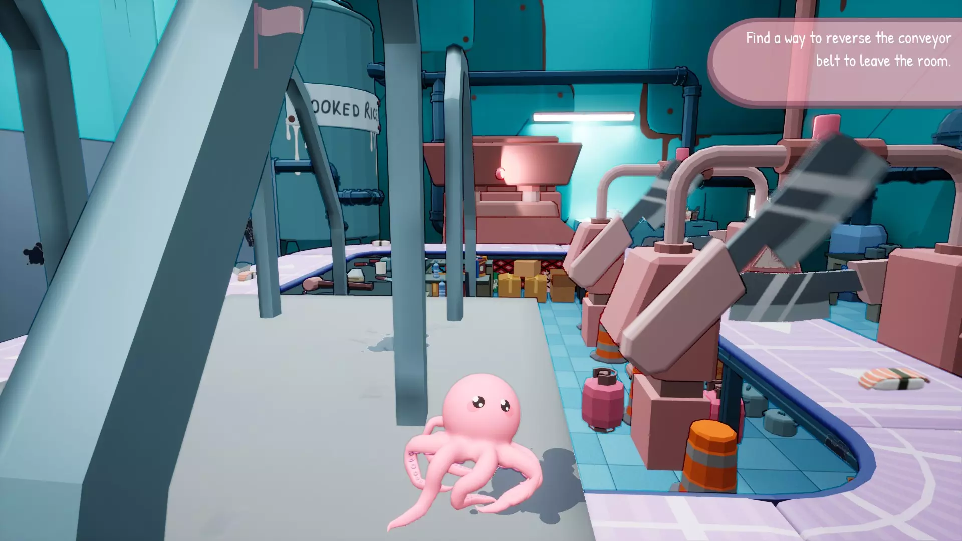 ------寿司工厂------当你遇到寿司生产线时,从砧板上救下你未来的兄弟们,并将丙烷罐扔向机器。对于菜刀,你必须将其扔向机械臂的当一切都被炸掉后,你上方的桥会断裂,形成一条不错的近路,此时成就应该会解锁。经过寿司工厂后,正常继续前进,你会遇到这些楼梯。检查楼梯后面,应该能看到一个独角兽浮板,捡起它。到达关卡终点,尽情享受游戏吧!你应该是在完成“no more pole dancing”成就时获得的这个,或者通过投掷任意丙烷罐也能得到。共需收集31个,我已撰写了另一篇指南介绍它们,本指南不再赘述。