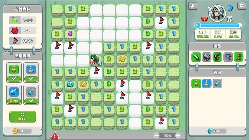 《扫雷与地下城》是一款融合了扫雷和肉鸽玩法的RPG游戏,玩家需要以经典扫雷机制探索游戏世界、收集金币和宝箱,通过技能、装备和道具的构筑来提升实力,历经不同世界区域和不同特点敌人的考验后,方可完成最终冒险。【扫雷+肉鸽,有推理也有挑战】既需要具备经典扫雷的推理能力,也需要进行极限的局内构筑,玩法简单,想通关并不简单。【局内升级成长,局外天赋养成】肉鸽游戏的标配不能少,局内升级后技能三选一,每局不管输赢都可带出符石进行局外天赋养成。【六个章节,扫雷也有大世界】森林、沼泽、沙漠、雪山、火山、魔城,每个区域都有各自的特点,不断有新挑战,紧张感拉满。【六个角色,解锁不同的体验】见习骑士、长袍法师、精灵猎手、维京勇士、虔诚牧师、萝莉巫师,每个角色都有各自特长,助你早日达成通关。
