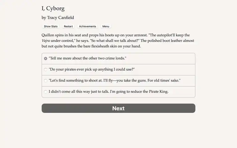 Outfly, outshoot, and outwit your enemies as an outlaw cyborg on the run! You're a cyborg copy of Ypsilanti Rowe, the interstellar outlaw, whose enemies (and exes) are gunning for you. Can you upgrade your brain and pull one last heist?I, Cyborg is a 300,000-word interactive science-fiction novel by Tracy Canfield. It's entirely text-based, without graphics or sound effects, and fueled by the vast, unstoppable power of your