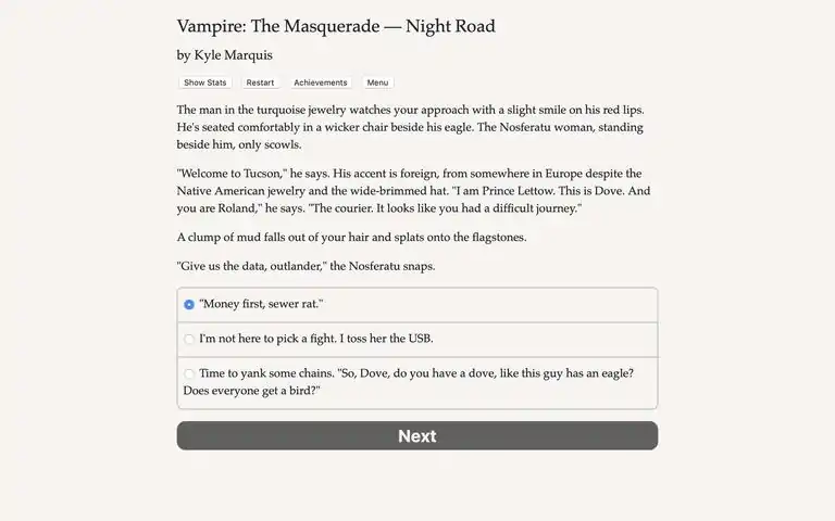The elders have entrusted you, an elite vampire courier, to deliver their secrets. Can you outrun the hunters, the other drivers, and the rising sun?Vampire: The Masquerade — Night Road is a 650,000-word interactive horror novel by Kyle Marquis, based on Vampire: The Masquerade and set in the World of Darkness shared story universe. Your choices control the story. It's entirely text-based—without graphics or sound effects—and fueled by the vast, unstoppable power of your imagination. It won the "Best Game" award in the 2020 XYZZY Awards for interactive fiction. It’s a new Dark Age for the dead. When the Second Inquisition's vampire hunters hacked phone lines and computer networks to expose and destroy vampires all over the world, the elders turned to undead couriers like you. For ten years, you’ve raced across the desert between cities, delivering vital information and supplies. But when an old friend reappears with a plan to disrupt the blood trade across the American Southwest, everything you’ve built starts crashing