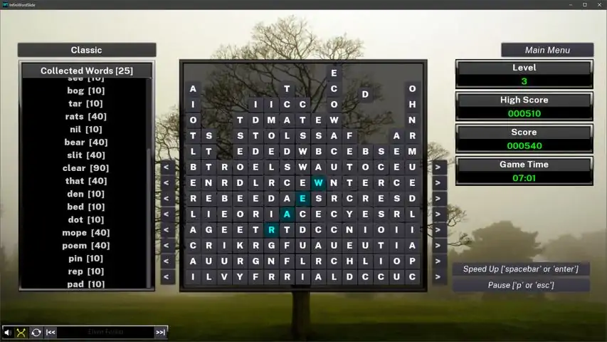 Midway between the word search and the *tris games, this game challenges your mastery of the language, your ability to strategize, your reaction time and your attention to detail. In the Classic mode, you must race the clock to find words on the grid and prevent the ever falling letters from reaching the top of the screen. Filled rows will let you slide sideways, a real key to staying alive! In contrast, the Zen mode gives you an eternally filled grid where your only goal is to find as many words as you want, at your leisure. If you'd rather play with a full grid, yet keep the pressure on, the Time Attack mode might be what you're looking for. Finally, the Escalation mode will reward your ability at making long words, for queuing small ones will mark the end of the game. Infinite gameplay, no real upper score, simple controls and clear mechanics makes this a fun arcade game without any cheap continues. More to come very, very soon.