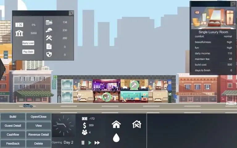 Hotel Manager Simulator is a game where you can experience daily life of a hotel manager. Druing the game, you will be able to have a taste of hotel manager's daily life including:develop hotel arrange rooms for guests talk with guests deal with different events manage hotel cashflow Other features:Some guests may have some crazy speeches or traits. The way you treat guests while talking with them may have effect on hotel status or how this game will end with. There are actually a lot to explore while interacting with NPC in the gameBesides, relaxing music and game env will provide a pleasant experience. Welcome, to the golden age!