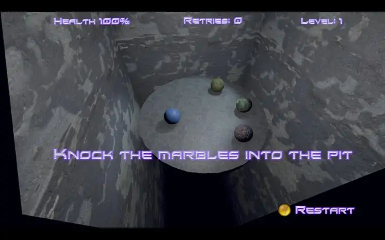 Do you have what it takes to become a Marble Master? Destroy the enemy marbles through 50 levels in this challenging physics based action puzzler. Avoid falling into the deep dark pit while bumping the enemy marbles down the depths to their doom. Knock your opponents into the deadly spikes shattering them to pieces. Use blocks as shields from the relentless marble onslaught. Complete all levels to become a Marble Master! "Easy to pick up, difficult to master."