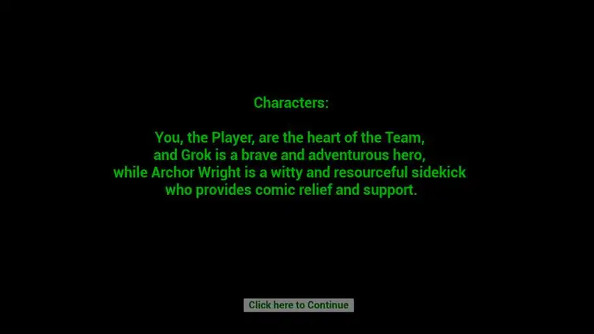 GROKAI This is an A.I. Generated Text Based "Create Your Own Adventure" Game You help form a Team of worthy Adventurers to go on Several Quests over Many Challenging Levels Characters: You the Player are the heart of the Team, and Grok is a brave and adventurous hero, while Archor Wright is a witty and resourceful sidekick who provides comic relief and support. Setting: In an unknown time, the world has become a place where PUNs and MEMEs reign supreme. The International Court of Justice has ruled that all conflicts must be resolved through the use of wordplay and humor, and the United Nations has been replaced by the United PUNs and MEMEs (UPM). In this brave new world, even the most serious of issues are tackled with a healthy dose of laughter. In this setting, the "Choose Your Own Adventure" game genre has become the primary form of entertainment, as people seek to escape the absurdity of everyday life. Players can explore a variety of humorous and pun-filled worlds, where they can make choices and shape their own destinies. From the post-apocalyptic wasteland there is something for everyone in this diverse and engaging genre. As players embark on their adventures, they can take comfort in the fact that they have the power to make a difference in their own virtual worlds. In a time of laughter and absurdity, these games offer a unique opportunity to explore, learn, and grow, all while having a bit of fun along the way. Features : Choices Matter Multi-Path Cool Text Styling Uses a Unique A.I. Generated Text Based System Can You spot ALL of the "Easter Eggs" in the Game? * NOTE : The Game is TEXT BASED and ENGLISH ONLY at this time. *