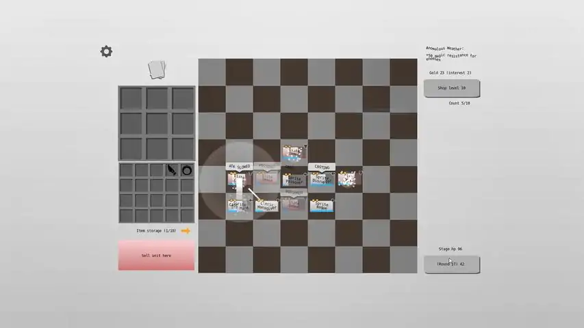 一款仅单机 PvE 的自动战斗游戏。管理卡牌(战士),合并战士以提升等级。有各种道具及技能。直接进入 50 个随机性的回合。胜利条件是存活至第50局。内容有大约90种棋子,60种敌人,大约30道具。大部分的棋子有独特的技能与效果。流程(Demo只到第36局)总共有50局,每局50秒。敌方会随机性的被放置在棋盘上。每局会发5张牌,可以付费重抽。合并3颗同名同级的棋子以提升一等级,最高等级为三。快进功能能够快进3到5倍。