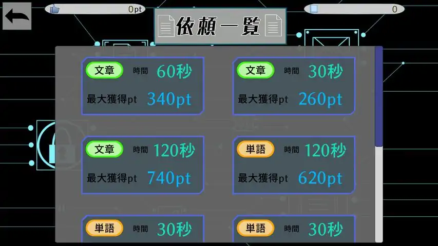 あなたは今、この瞬間からハッカーになりました。依頼について・単語と文章の問題の種類はなんと600以上!!・正確かつ早くタイピングすると、もらえるポイントが多くなります。・数字が含まれる問題文は出てきません。タイピングについて・柔軟なキーボード入力に対応!・長押しで入力されることはありません。その他・SEの音量調整が可能飽きずにタイピング練習ができます!単語と文章は随時追加予定!!