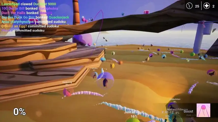 Duckball is an action-packed battle royale game where up to 100 players compete to be the last duck standing. Play with friends online and collect wacky items to knock your opponents off the stage in an ever changing 3D environment. Do you have what it takes to be truly glorious? There are 2 main gamemodes to choose from: Deathmatch and Battle Royale. In the Deathmatch gamemode, if you get knocked off of the stage, don't worry you'll respawn in a cannon and be launched back into the fray. In Battle Royale, you have only one life and want to knock out all of your competitors. Roll into the items that are scattered throughout the arena and use them to fight and outmaneuver your rival ducks. Try combining various items such as Flight, Boost, and Bullet to become a fly by Duckball fighter jet! Customizable rulesets provide an unlimited amount of gameplay scenarios. Dive into the world of Duckball and discover what other secrets await.