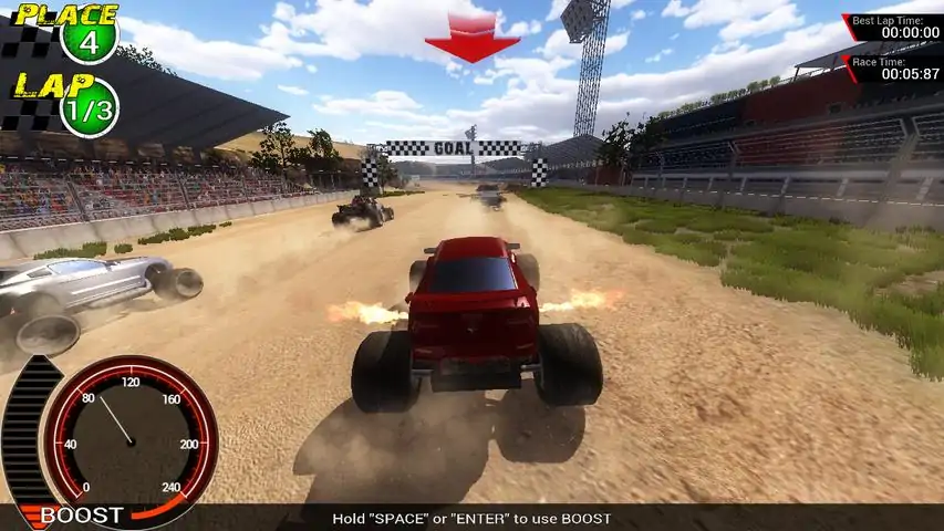 Take control of a 4-WD racing truck in Off-Road Super Racing. This challenging racing game offers a championship mode where you can reach for the gold medal and a free single race mode. This 3D-racing game is powered by a realistic physics engine to make it challenging for experts and easy enough for everyone else to try. The game features five different cars with 12 upgrades for each. Customise your racing truck in the garage with more than 100 unique paint options. By carefully choosing the right upgrades you will find the right balance for speed, acceleration, suspension and control. Use the nitro boost to race past your competitors in the race. Off-Road Super Racing has six different tracks, all of which can be accessed in the single race mode. Make sure you are familiar with the race tracks before enter the championship mode.