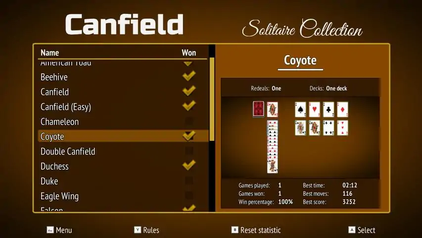 20 popular Canfield games in one Do you love Canfield (also known as "Demon" or "Demon Patience"), but want a bigger challenge? Now you can play Canfield and other popular variants with different levels of difficulty. The collection contains: • Acme • American Toad • Canfield • Chameleon • Duchess • Gate • Rainbow • Storehouse • Superior Canfield • Wings Plus 10 more... Features: • Unlimited undo • Auto complete • Statistics • Rules for each game