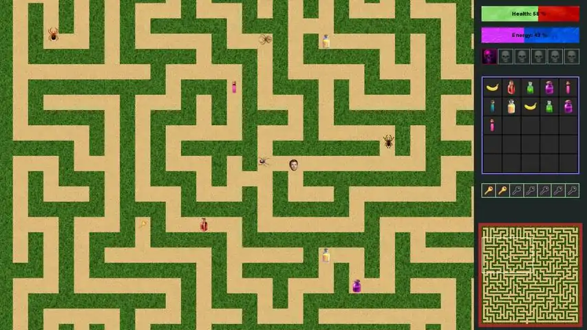 Are you afraid of spiders?, then this game is not for you. You will feel like a resident of Australia. There are more spiders in this country than stars in the universe. The spiders here are huge and each of them wants to bite you in the ass. In this game you will have to get out of mazes filled with spiders. There are 12 mazes in total, each of which has its own level of difficulty. At the exit of the maze there is a door, to open which you need to have 7 keys scattered throughout the maze. You must collect them all. Movement wastes your energy, which needs to be replenished, so collect fruits and eat them. Try to avoid collisions with spiders. When confronted, the spider bites you, reduce your health and inflicting a negative effect. There are many of these effects, each of them reduces your abilities and prevents you from surviving. To dispel the negative effect, you need to drink the appropriate antidote. If you get to the 10th maze, you can consider yourself a real Australian. But only a few will be able to go further.