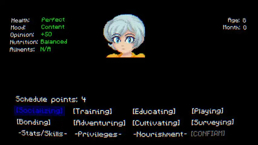 In Eshina Princess Cultivator the player fills the role of Eleora Eshina's caretaker, whom is destined to rule hegemonic power of the Sorbia continent, the Imperial Realm of Ekaria. You will be directing her growth as you see fit until she is ready to ascend to the throne. But will she be ready?GAME FEATURES[Protecting] Eleora's safety must be ensured, but don't make her feel constrained.[Socializing] Eleora needs to have basic social skills if she is to talk to her people.[Training] Eleora may need to train her body, or magical prowess to fight if need be.[Educating] Eleora requires education in statesmanship and others if she is to lead.[Feeding] Eleora must consume the correct amount of nutrition and healthy foods.[Playing] Eleora could have an allotment of play time so she isn't stressed out.[Adventuring] Eleora must know and embrace the world outside her gilded