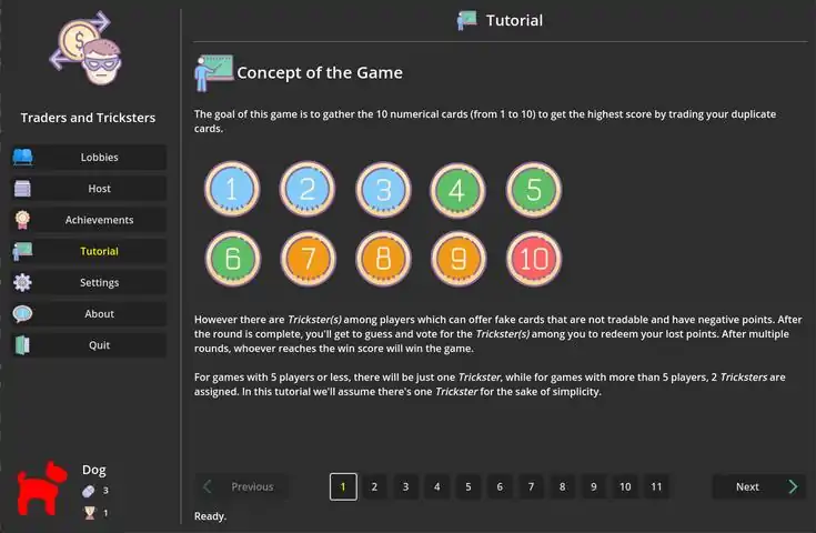Traders and Tricksters is an online multiplayer board game. The goal of this game is to gather the 10 numerical cards (from 1 to 10) to get the highest score by trading your duplicate cards. However there are Trickster(s) among players which can offer fake cards that are not tradable and have negative points. After the round is complete, you'll get to guess and vote for the Trickster(s) among you to redeem your lost points. After multiple rounds, whoever reaches the max score will win the game.