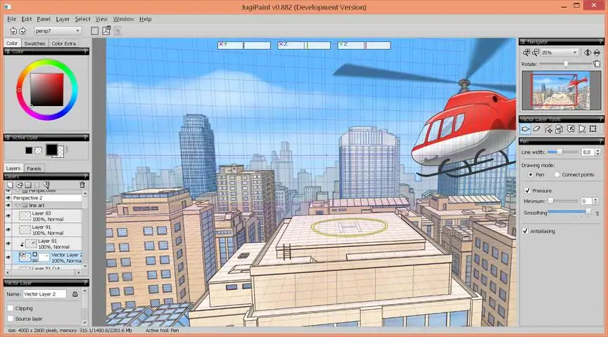JugiPaint is a painting software with diverse tools for various illustration works. It provides many standard digital painting features like layers, brushes, selections, transformations, etc., as well as some less often like guide layers and panels. The raster based painting and editing capabilities are supplemented with powerful tools for creating vector based line art. JugiPaint is the successor of Comicado and is also well suited for creating comics. Key features: - a versatile brush system which powers a wide range of brushes with a high level of customization - vector drawing - filter layers - text layers - guide layers - perspective and simple mannequin - layered panels for comics creation - rulers