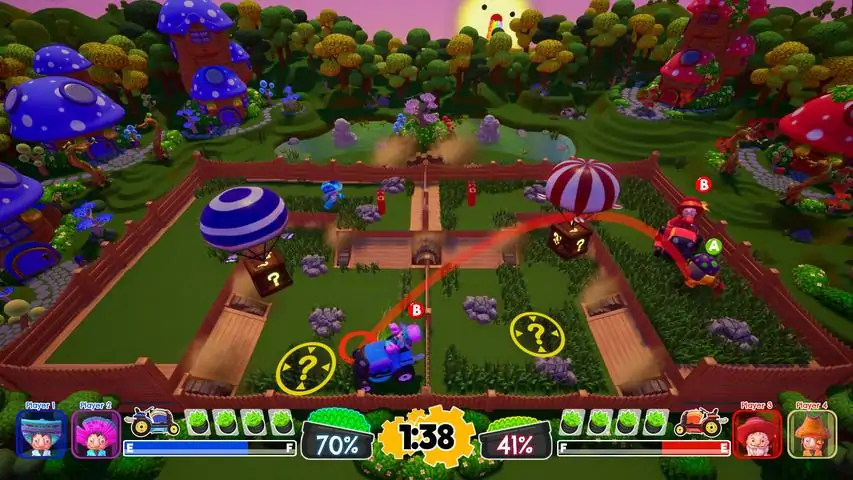 Play as lawn gnomes and wreck your neighbor's yard by throwing rocks, fertilizer bags, and psychedelic mushrooms. Race around in a nitro boosted mower to pickup grass and blast unsuspecting opponents with its hidden tank cannon. Mowin' & Throwin' is great to play with friends, family, or people you only sort of like. The experience is best played locally, but is playable online through PARSEC. Mowin’ & Throwin’ is a competitive lawn mowing experience where the objective of the game is the have the LEAST amount of grass on your lawn before time runs out. Mow down the competition in our 2v2 or 1v1 game modes. Customize your experience by choosing between two zanny gnome avatars as well as their hat. This game requires controllers, but will soon support keyboards and full keyboard / controller button remapping! A stunning variety of items drop from the sky during the match. Use them to knock gnomes of mowers, regrow grass, or flip your opponent’s controls!Ever wonder what it's like to drive a riding mower that's souped up with nitrous and a tank cannon!? Experience the thrill of mowing at breakneck speeds to gather grass bag ammo to shoot at your rival team's yard! Grow closer with your friends by teaming up! Or ruin that friendship with a well aimed rock! Keep the couch fun during parties or when you need a break from the online world. A single match only takes a few minutes, but Mowin' & Throwin' can keep you and your friends occupied for seasons. The controls and objective of Mowin' & Throwin' are easy to learn. But if you want to be a cut above the rest, you'll need to master each lawn's unique challenge to turn them to your advantage!Each lawn is unique and creates challenges that affect how you mow and throw. Some examples include shifting terrain, elevators, destructible environments, darkness, and more!