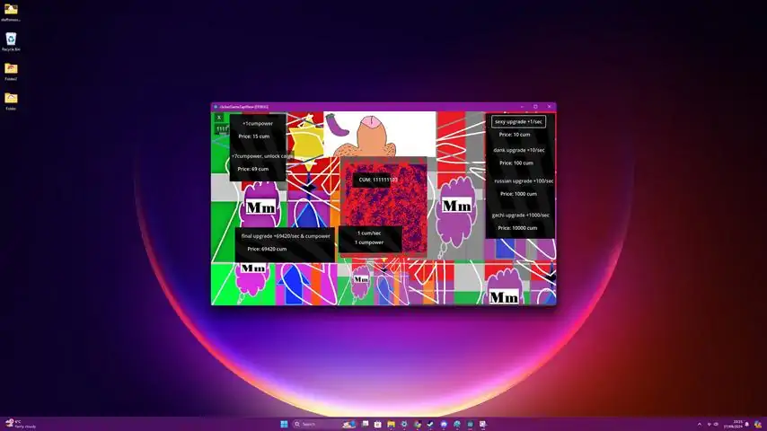 This is a clicker game where you will have to click a specific object (I won't ruin the surprise) in order to collect points, purchase upgrades and win the game. There are multiple upgrades which will allow you to increase your click power and auto clicking potential. This is a small game designed with humor in mind and is satirical in nature.