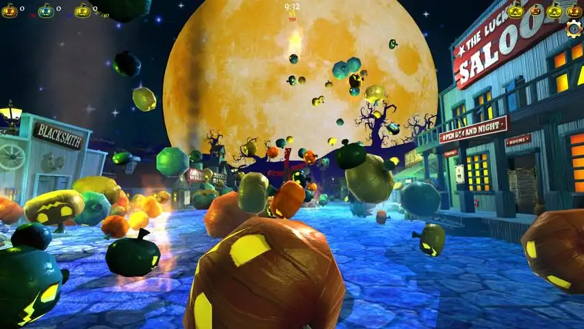 What's It About!It's a first person collector! The game plays like a first person shooter but the purpose is to collect things – namely pumpkins! Set in a town populated by skeletons, your task is to gather pumpkins hurled at the town by the local witch. Deliver them to your local chefs at the mills to make pies and earn points. Perform well and the witch will leave you alone – that's until the next full moon!Game PlayThe pumpkins have to be collected (you can carry 5 at a time) and delivered to the chefs at the mills. The pumpkins come in three colours and three sizes. You'll get more points for blue than red pumpkins and even more points for the yellow. Red pumpkins have to be delivered to the red chef, blue pumpkins to the blue and yellow to the yellow chef. The larger the pumpkin the more points you'll get – but the larger they are the heavier they are and you'll move slower. Plus you'll get bonus scores if you collect pumpkins in batches of the same colour (three or more). So collecting pumpkins in the order; red, red, red, blue and yellow gives you a higher score than a red, blue, red, yellow, red collection. When you deliver your pumpkins to each chef you will get bonus points. The chefs will start to work making pies. Once a pie has been made you can visit the chef to pick them up. You can use these pies to buy stuff to help you get your job done! Each level you will be set a target, which could be a set number of red, blue or yellow pumpkins, and/or a set number of points. Plus the witch is impatient and each level you are up against the clock (you are generally given less than 10 minutes to complete each level)! Pumpkins tend to go off quite quickly and burst! This means you'll have less pumpkins to pick up – which might mean you can't complete the level! Also if you happen to be near a pumpkin when it bursts you'll get splattered which will slow you down! (Hint: visit the doc at the hospital to get fixed up).The TownIf you've got some pies you can go over to the townsfolk and they will exchange your pies for stuff that might help you: Gym – gain strength (for a short while). This will enable you to carry those heavy