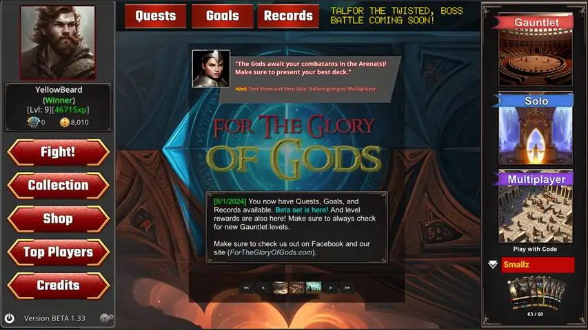 刚刚更新Version 1.57 Ready to Play!关于游戏The Gods are bored.. and they have decided to do battle against each other! By utilizing the greatest fighting factions in history, they do continuous battle for fame and glory! Chosen from the Spartans, Romans, and Vikings, to the Gladiators, Samurai, and Egyptians.. their arena battles are legendary!! Come join in today!An alternative online trading card game that allows unlimited deck-building and competitors, both AI and live! Three different game modes that include Gauntlet, Solo, and Multiplayer options. Many player and deck customization options to earn and choose from. From Daily/Weekly Quests and Goals, to Login Rewards, Records, and Leaderboards, there is plenty of ways to earn, brag about, and immortalize yourself For the Glory of Gods!