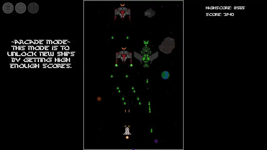 A simple arcade style space shooter. Unlock new ships by getting higher scores in Arcade Mode and use the ship you like in survival mode (Coming Soon) where you will be pitted in six different levels with relentless attacks from the enemies.