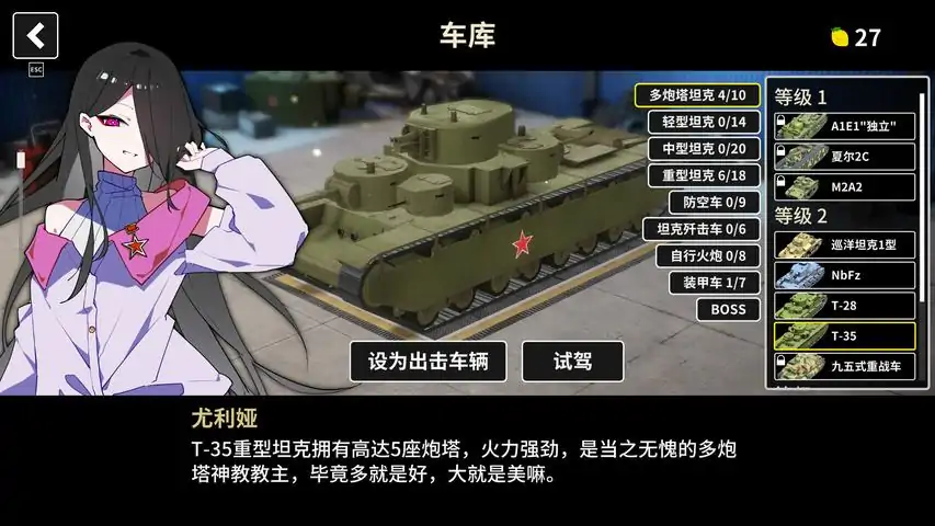 想成为这游戏的一部分吗?《多炮塔神教》是一个稍微带点肉鸽要素的俯视角坦克射击游戏,你将在苏联校园成为车长,带领坦克社团的学生们进行坦克游戏。选择车辆目前游戏中有超过100辆二战载具,你可以选择一辆作为出击载具。改装车辆每辆坦克的炮塔是可随意拆卸的,在任务中还能获得其他车辆的炮塔装在自己身上,变得更强。招募乘员坦克社团的学生们各具特色,在战斗中将她们加入车组能使车辆获得新能力,和你一起赢得胜利!