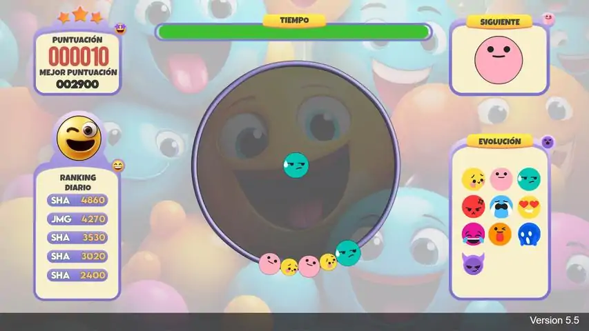 The aim of the game is to score as many points as possible by matching emojis of the same type before time runs out. When you combine two emojis, you gain time. The bigger the combination, the more time you get. In this way, the best players can extend the game indefinitely. There are ten types of emojis which, as you combine them, increase in size. The complexity of the game increases the more points you score. Emojis can rotate on themselves, increase their speed, change their position or appear somewhere in the game circle at random. The top five daily, weekly and monthly scores are recorded in their corresponding rankings, but only the top five scores of all time can be recorded in the world ranking. After your game, if you make it to the top, enter your three-character username and don't let anyone else beat you.