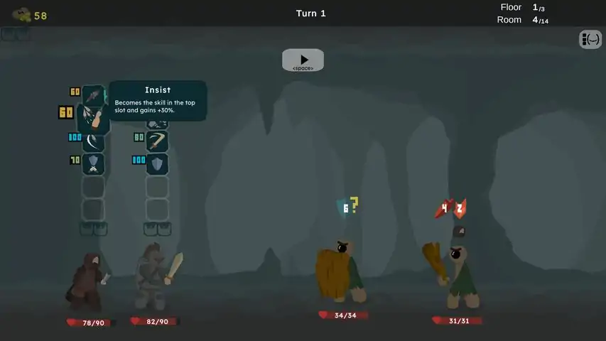 A turn-based roguelike where skills have a probability of getting executed. Your characters have an ordered list of