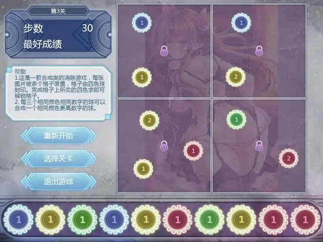 玩法介绍这是一款合成类的消除游戏,每张图片被多个格子覆盖,格子由四色球封印。完成格子上所需的四色球即可解锁格子。每三个相同颜色相同数字的球可以合成一个相同颜色更高数字的球。游戏介绍四色幻想是一款个人制作的休闲情色游戏,游戏中的美术及音乐资源并非原创。游戏包含了30个关卡,60个成就,难度适中,希望能让大家的儿子喜欢。彩蛋社保码:sonlovesthis