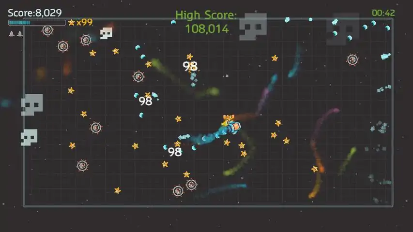 KosmoSquad is a twin-stick arena shooter where you survive as long as you can against an ever-increasing hoard of enemies. Fight alone or with up to three friends and collect star multipliers to maximize your high score. Use your score points to purchase upgrades for your ship and try again!KosmoSquad has eight levels with nine difficulty settings for each level. Increasing difficulty increases the score value of enemies and the multiplier cap, allowing you to earn more points and progress faster. Upgrade your shot damage, distance, speed, and rate of fire to bring impossible challenges within