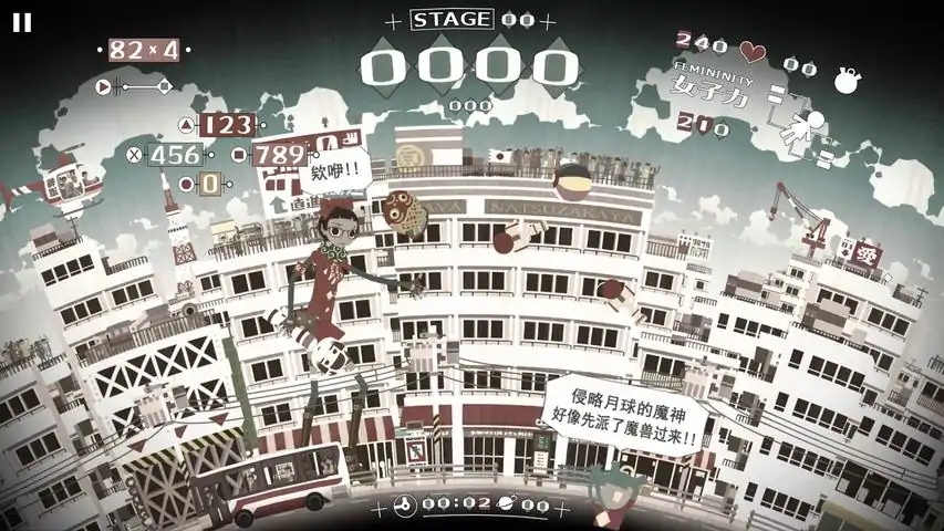 操纵巨大女子(山田院花子)保护被宇宙魔神侵略的地球,循环系横向卷轴射击游戏。・利用屁股火箭在空中飞行,环游地球!!!!使用消耗生命的加速喷射可瞬间昼夜交替,绕地球一周・以女子雷达和千里眼快速发现敌人,用巨大机关枪将其粉碎!!!!使用枪、激光、剑等各种武器将敌人四分五裂・在2D空间中可全方位移动和射击。搭载了直感操作「女子AIM」系统!!不仅可直线射击,还可配合身体的倾斜进行斜射,能够随心所欲地向任意方向射击。・用格斗游戏般的复杂操作拳打脚踢!! 然后将其吃掉!!面对大量的敌人,不是躲避,而是用格斗技能将其打到,杀出一条血路,并将杀死的敌人吃掉。从敌人的残骸中获得的营养素,可以转换为保持美丽与健康的「女子力」・每扔一次炸弹,你一定会变成天才!!不知道为什么,回答了一直显示的计算问题后,就会扔出炸弹。即使不回答问题,一段时间后也可以投掷炸弹,所以无视也OK。不仅是计算问题,也可以上传自己制作的问题。・成熟可爱系,目标是装扮达人!!收集敌人掉落的巨大的硬币用来购买服装,可以为角色换装。