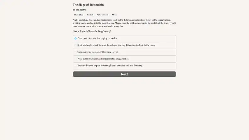 Rule a magical city and defend it from an enemy army! In this epic fantasy game of swordfights, warfare, politics, and romance, can you prove worthy of your throne?The Siege of Treboulain is a 260,000-word interactive novel by Jed Herne. It’s entirely text-based, without graphics or sound effects, and fueled by the vast, unstoppable power of your