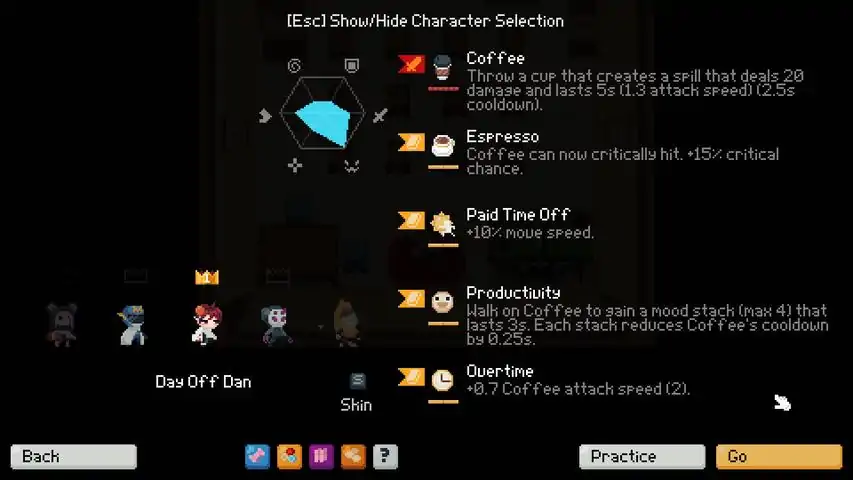 Find latest news, teasers, suggestions/feedback, FAQ on our official discord!Enjoy online co-op with up to 4 players!Fight, level up, buy, survive! Choose from multiple stages! Can you do it? Start off at level 1 with only your character's unique weapon. As you fight mobs, they will drop XP, which you can collect to level up. Leveling up opens up a shop where you can purchase new equips or upgrade your current ones in order to become