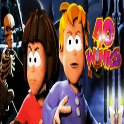 FIGHT AS A NINJA. TRANSFORM INTO A ROBOT...OR A MONSTER! Fight skeletons, spiders and aliens. Battle with robots, zombies, giant dinosaurs... In this dangerous, dream filled 3D adventure game, everything is out to get you! CAN YOU BEAT THE EVIL DREAM THIEF, THE SCHEMING NITEKAP, AS YOU JOURNEY THROUGH 6 NIGHTMARE WORLDS? 40 Winks is an action platformer where you control brother and sister, Ruff and Tumble. Your goal is to collect 40 Winks scattered around the world to stop an evil man called Nitekap. Nitekap wants to turn the winks into hood-winks who are responsible for giving children nightmares. Game Features: •Transform into different characters! Attack as a stealth ninja, fight as ferocious monster, or fly into action as a super hero! •Tons of mini-games as well! Race dragons, strap on a rocket, and more! •6 themed levels - a scary castle, shipwreck city, outer space, deep down underwater, back to the prehistoric world of T-Rex and giant wasps and into the nightmare world of ghosts and monsters.