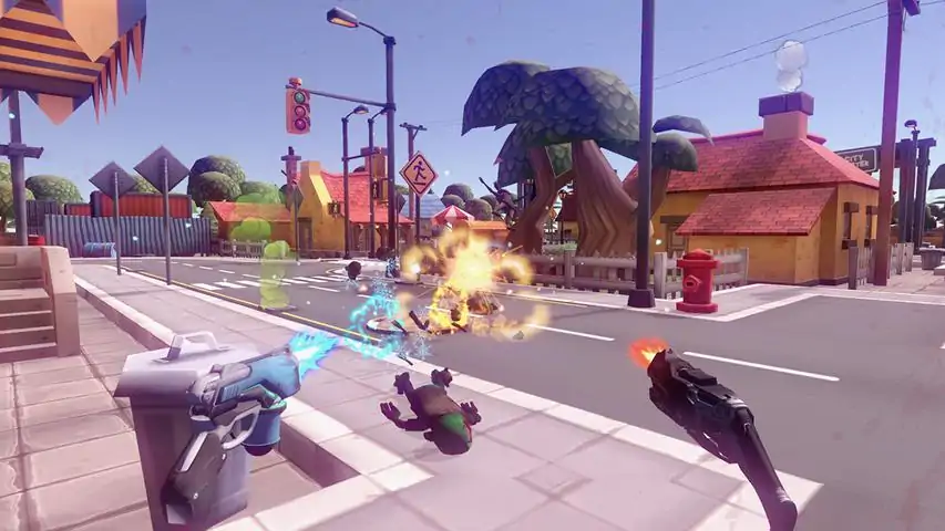 《ZombiesTown/僵尸小镇》是一款基于VR设备的第一人称卡通射击游戏。 玩家在一个卡通的小镇中,偶遇了许多各式各样的僵尸与怪物,这些可爱的僵尸们只是希望给你一个大大的“拥抱”。你可以使用你手中的各种武器与他们战斗。 不同的怪物拥有着特殊的技能,施放烟雾的僵尸,会爆炸的僵尸,跳着杰克逊经典舞步的僵尸,还有老远吐着炮弹的大花,天上飞着的蝙蝠们蜜蜂们等等,都来参加这场欢乐盛大的聚会。 你要怎么样才能在这场聚会中存活到最后呢? B.H.C.M.工作室是一个只有3个人的国人工作室,致力于为您精心打造愉快的游戏体验。希望大家多多支持!