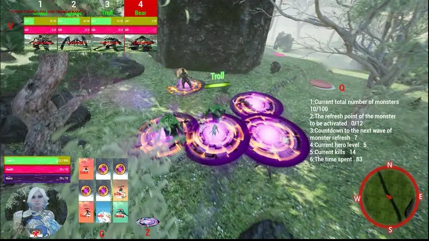 1: Introduction to the gameThis is a third-person 3D real-time battle game. Players can choose different heroes, use different skills to kill monsters, gain experience and followers. The enrolled followers can be arranged in different formations to fight with the heroes. There are red monster refresh points on the map, and some monsters will be refreshed at regular intervals. When the total number of monsters exceeds 100, the game fails. When the hero level reaches level 10 and multiples of level 10, the challenge is successful, and then the player can choose to continue the challenge or quit the game. The hero only needs to stand on the red refresh point for a certain period of time to turn the refresh point into green. At this time, the monster's refresh time will be extended. When the hero is upgraded, the hero's level, ranking and time used will be recorded on the leaderboard. The time is in seconds. The main interface of the game is shown below: 2: Hotkey functionX: Select the