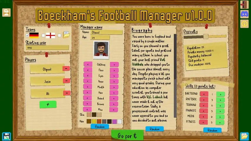 The gameBoeckham's Football Manager is an old-school management game in which you are in charge of a soccer team. To be successful, you need to manage your players, buy some cheap and sell some with profit, and care for them when they get into trouble. Build your stadium and expand the facilities. Negotiate with sponsors to finance all of the
